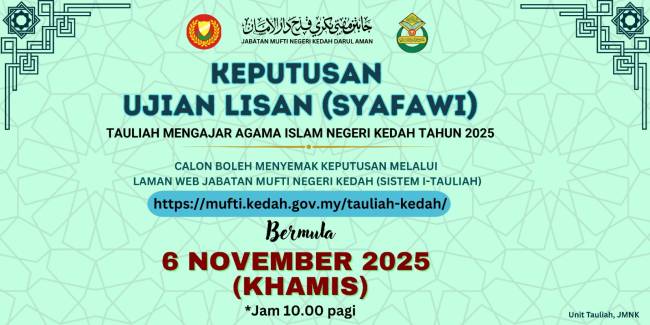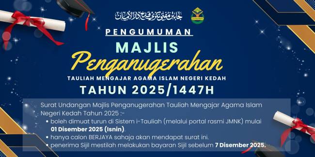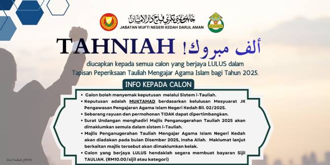 Penerima Tauliah Mengajar Agama Islam Negeri Kedah bagi tahun 2025 boleh memuat turun surat undangan ke 𝑴𝒂𝒋𝒍𝒊𝒔 𝑷𝒆𝒏𝒈𝒂𝒏𝒖𝒈𝒆𝒓𝒂𝒉𝒂𝒏 𝑻𝒂𝒖𝒍𝒊𝒂𝒉 𝑴𝒆𝒏𝒈𝒂𝒋𝒂𝒓 𝑨𝒈𝒂𝒎𝒂 𝑰𝒔𝒍𝒂𝒎 𝑵𝒆𝒈𝒆𝒓𝒊 𝑲𝒆𝒅𝒂𝒉 di laman web rasmi Jabatan Mufti Negeri Kedah bermula 𝟎𝟏 𝐃𝐈𝐒𝐄𝐌𝐁𝐄𝐑 𝟐𝟎𝟐𝟓 (𝐈𝐬𝐧𝐢𝐧).